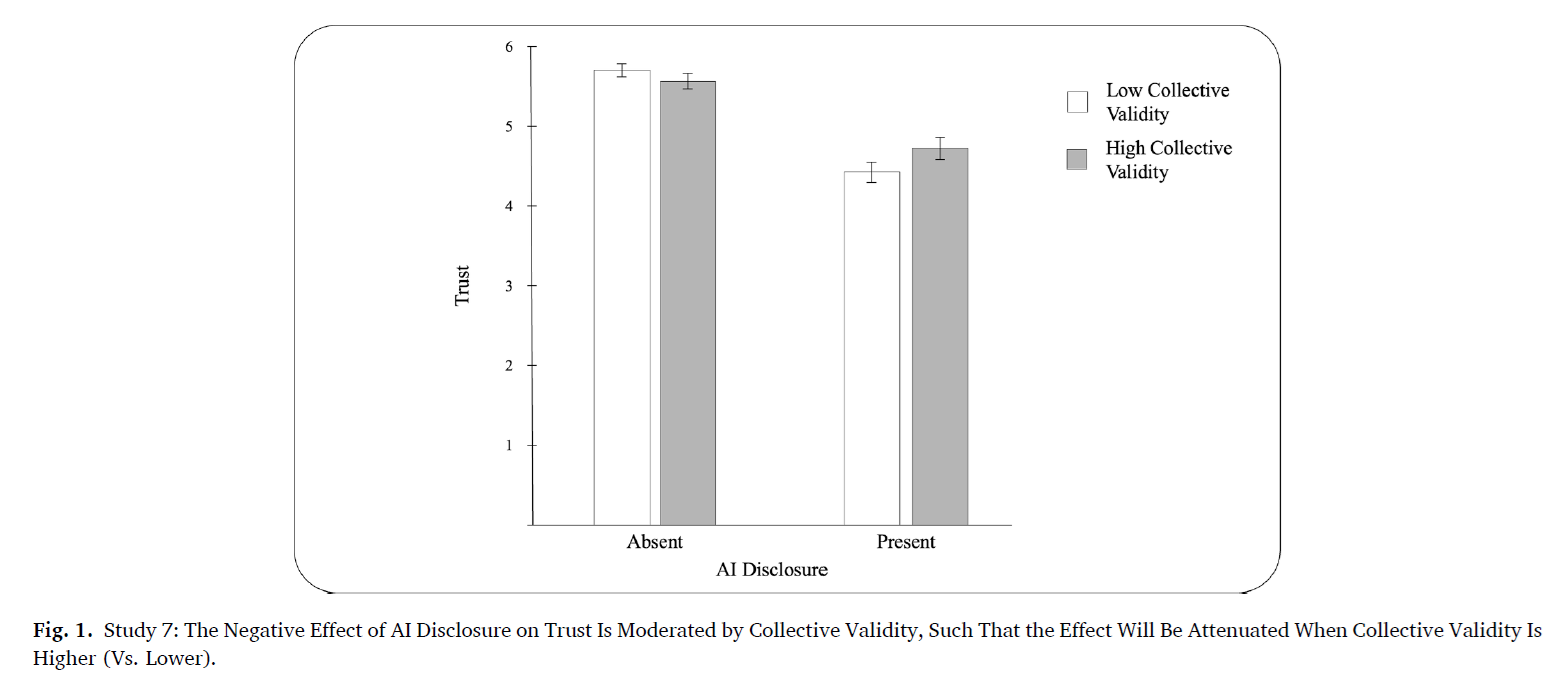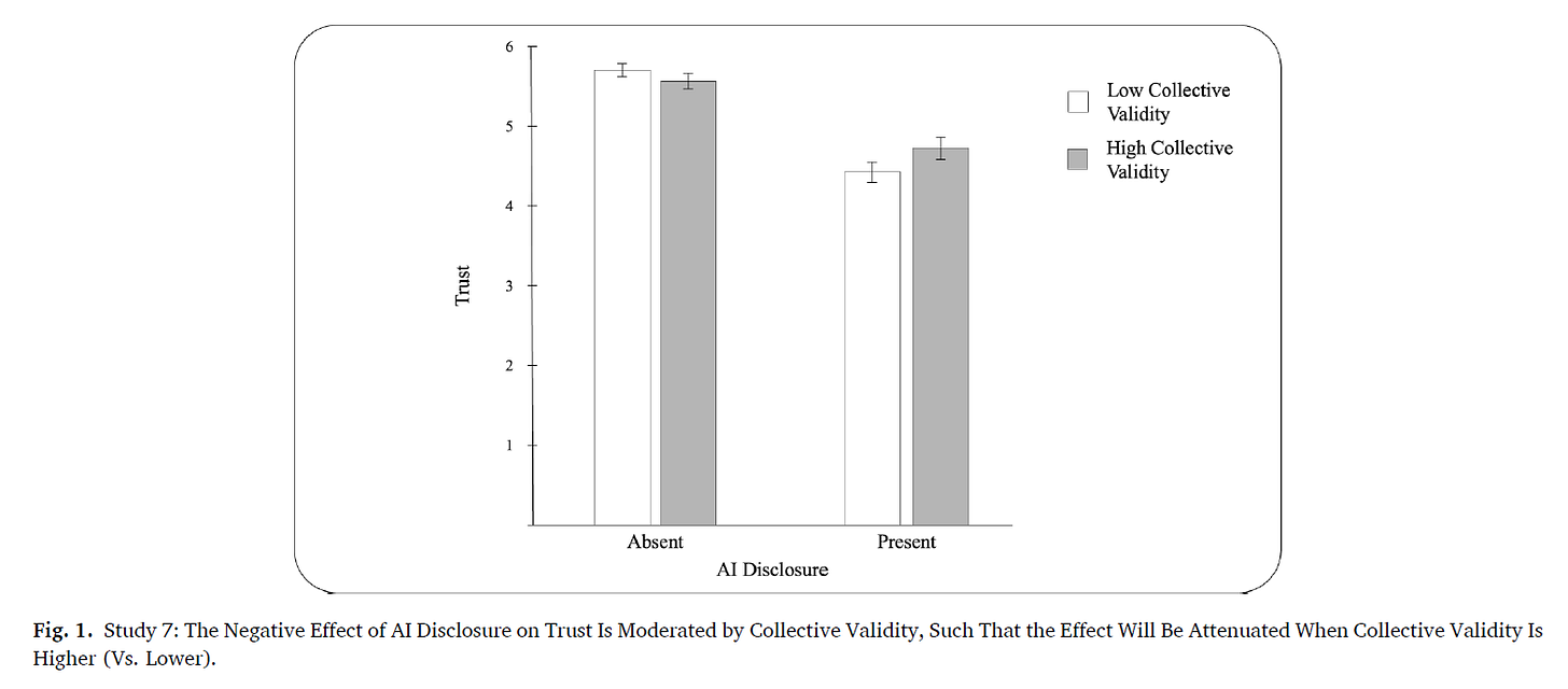 Study 7 (N=426): Startup founders who disclosed AI use received lower trust scores (M=4.55) than those who made no disclosure (M=5.63). This was a drop of over a full point on a 7-point scale with a very large effect size (d=0.93). The study's illustrates this gap and shows that the penalty was attenuated—but not eliminated—by priming participants with "collective validity" (making AI seem more common). The trust penalty shrank from a very large effect size (d=1.12) to a still-large but smaller one (d=0.72) when validity was high.